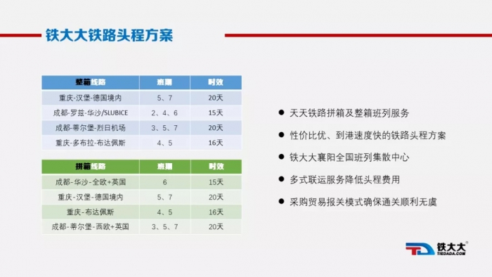 铁大大国际货运代理,专注中欧班列铁路拼箱公司网站(http://www.tiedada.com/)支持线路查询、下单、跟踪等。优质的公司信誉、先进的信息系统、充沛的资金实力、卓越的服务理念,为您专业、安全、高效的服务。电话:4008769870 qq:2853717269