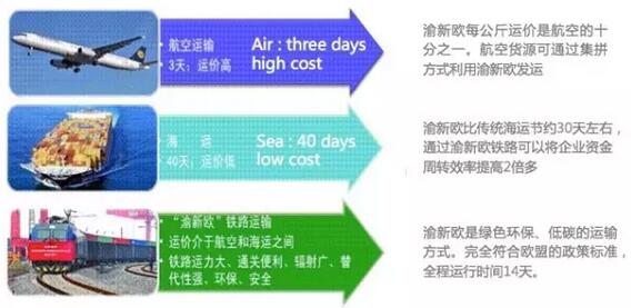 对比 一个集装箱通过渝新欧 铁路从重庆运抵杜伊斯堡或运回重庆 只需要14天,通关便捷 最主要的事运价合理,安全保障 所以, 这就是为什么有很多客户要选择渝新欧的原因 |
