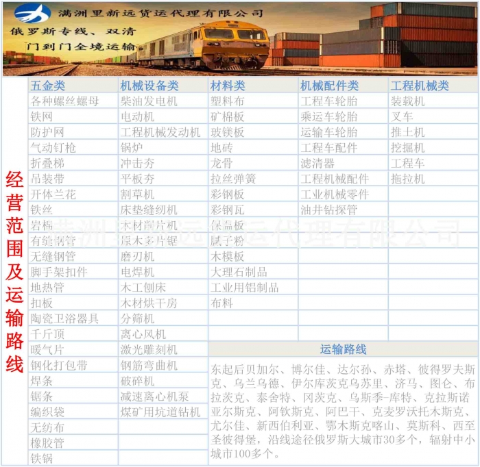 主要运输路线: 满洲里发货东起后贝加尔、博尔佳、达尔孙、赤塔、彼得罗夫斯克、乌兰乌德、伊尔库茨克、乌苏里、济马、图仑、布拉茨克、泰舍特、冈茨克、乌斯季-库特、克拉斯诺亚尔斯克、阿钦斯克、阿巴干、克麦罗沃托木斯克、尤尔佳、新西伯利亚、鄂木斯克喀山、莫斯科、西至圣彼得堡,沿线途径俄罗斯大城市30多个,辐射中小城市100多个,目前与我司合作的俄方运输公司已有8家,可用运输车辆100余台。 主营业务:俄罗斯物流,中俄物流,俄罗斯专线,俄罗斯专线物流,俄罗斯报关,清关,俄罗斯双清,国际快递,国际物流,国际货代,货运代理, 俄罗斯进出口报关代理,中俄报关报检,清关 双清 运输业务 陈女士:QQ/微信:806232304 图片:出口范围水印小.jpg |